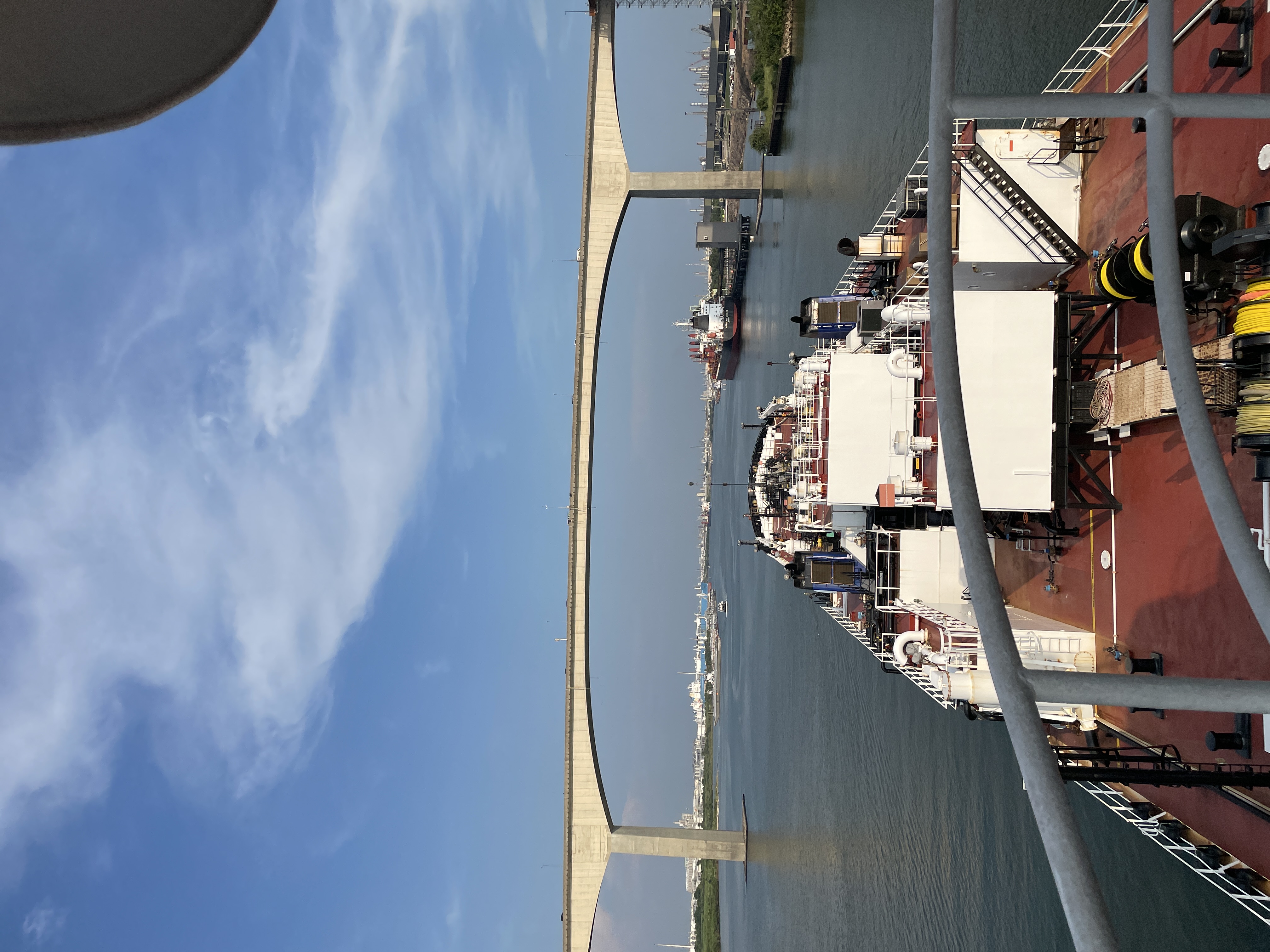 I heard Kristi call the other pilot on the radio, have a very quick exchange, then noticed that both ships were shifting a few degrees to their right. As we passed each other, port-to-port, both ships began to steer back into the middle of the channel. There are a lot of reasons for the Texas 3 Step. Every ship wants to stay mid-channel as long as it can, to avoid shoal water near the banks. Also, forces swirl around within the water which, if not controlled by the steady hand of a pilot, could redirect a ship – bow wave pressure, suction from the bank, low pressure forces from the stern of the other ship. Kristi took all of this into account as she steered down the channel and we passed the other ship without incident.