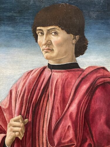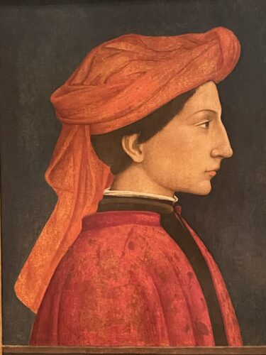 This young man is identified as Matteo Olivieri. His red clothing, together with the fact that his portrait was painted at all, indicates he had status in society. The portrait, though handsome, is relatively anodyne. A marker of social class or group identity, such as red clothing in the Renaissance, is not unimportant, but alone it does not convey much about the individual. Was he a rule-follower, or is something audacious brewing in his adolescent mind? It’s hard to know. The classically inspired profile pose limits our view of him. Also, I found a source indicating that the picture was painted many years after Matteo died, to let his descendants feel close to him. The artist may never have seen Matteo and relied entirely on others’ descriptions. That, too, would explain why it’s hard to fathom Matteo’s actual character.