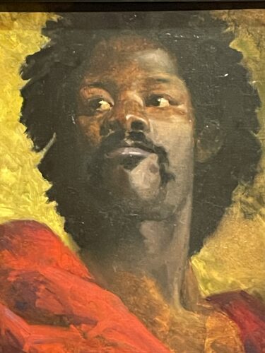 Regnault visited north Africa, but it’s not known whether he traveled to Ethiopia, formerly known as Abyssinia. Thus, we can’t be sure whether this portrait derives from his personal observation of an individual, or from another’s artistic rendering. What we do know is that Regnault shows the chief as strong and proud. He eyes something off to the side, and his mouth suggests he will not be afraid to act. I can guess from his countenance that action will be decisive but fair. He wears red, as do many others discussed, but the gold background elevates him further. As Regnault does here, a writer can situate a subject against a background or in a context that makes certain characteristics shine.