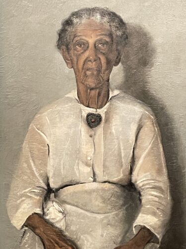 Here, the focus is on his grandmother, each wrinkle on her face and in her blouse lovingly detailed. Research indicates she was born enslaved and lived through the Civil War on a sugar plantation in Louisiana. Later, she moved north to live with her daughter’s family on the South Side of Chicago. Her bedroom was next to Motley’s studio on the top floor of the house. As she aged and found climbing to her room difficult, Motley would carry her upstairs at the end of the day. I think she looks wise but reticent, as though not bothering to impose her ideas on others. Sometimes, it’s okay to love your subject. You can still show the wrinkles.